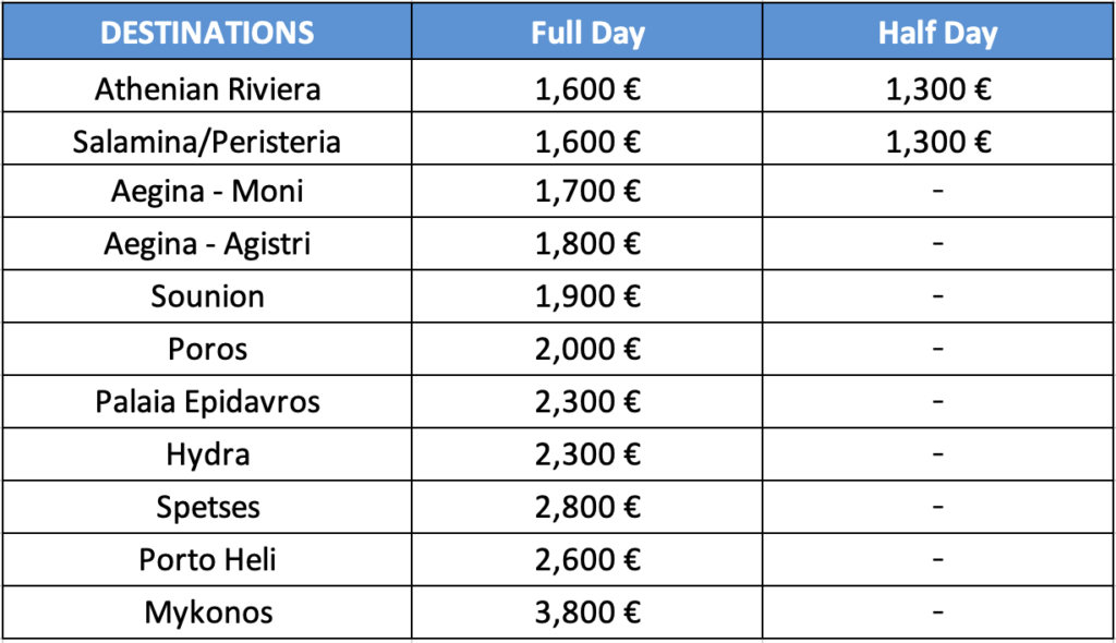 * For Multiple Day Trips, the cost for the yacht with skipper/captain is 1250€ per day, plus the cost of fuels and marina fees.